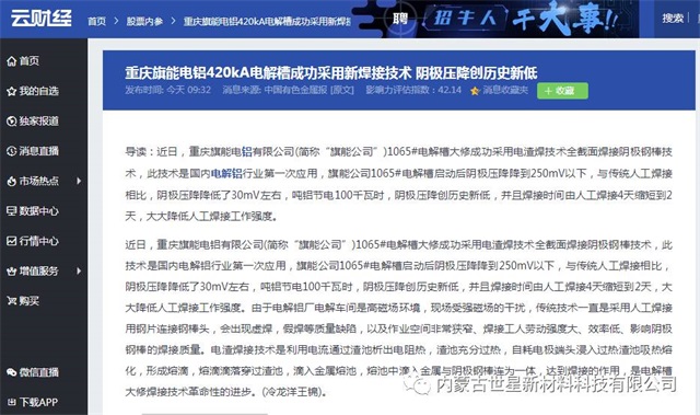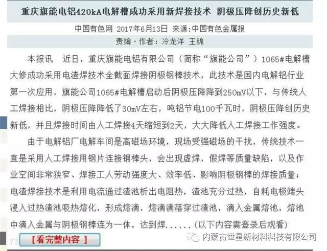 近日中国有色金属网和中国有色金属报上头条报道《重庆旗能电铝420KA电解槽成功采用新焊接技术 阴极压降创历史新低》,主要内容为:重庆旗能电铝有限公司1065#电解槽大修成功采用电渣焊技术全截面焊接阴极钢棒技术,此技术是国内电解铝行业第一次应用,旗能公司1065#电解槽启动后阴极压降降到250mV以下,与传统人工焊接相比,阴极压降降低了30mV左右,吨铝节电100千瓦时,阴极压降创历史新低,并且焊接时间由人工焊接4天缩短到2天,大大降低人工焊接工作强度,是电解槽大修焊接技术革命性的进步。