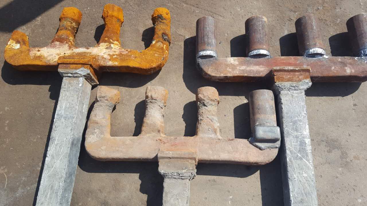 结构型节能香蕉网在线视频横梁、钢爪腿圆钢及电渣焊口材质均为Q235,经电渣焊接,三者充分熔合为一个整体,整个钢爪力学性能导电性能完全一致,钢爪腿与腿之间、批与批之间无质量差异。经电解槽实际测量,同比于铸钢爪,电压降降低15一20mv。